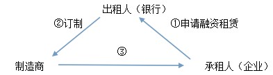 例如作為一個小微企業,現在需要進行生產線的升級,購進一臺價值100萬元的專用設備,但是沒有足夠的資金,那么只能去找實力雄厚的金融機構-銀行幫其購買,作為銀行,只是有錢不能生產設備,于是銀行就找到了能夠生產設備的制造商進行訂制,生產完成后交給企業,企業就可與銀行簽訂融資融資合同,建立了租賃關系。如圖: