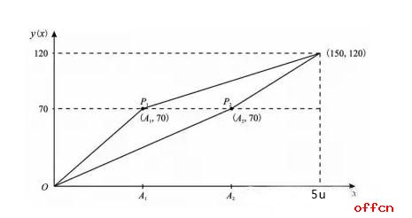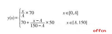 舉例來說,設(shè)兩個(gè)科目的合格分?jǐn)?shù)線分別為 A1和 A2,則轉(zhuǎn)換分 y(x) 關(guān)于原始成績(jī)x的函數(shù)圖像,如下圖所示: