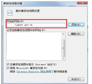 接著把天津市公開選調(diào)公務(wù)員或者公開遴選公務(wù)員報名的網(wǎng)站添加到兼容性視圖網(wǎng)站中去,如下圖所示