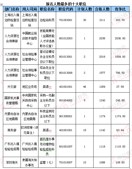 “人力資源社會部中國就業培訓技術指導中心”職位競爭比2000:1,是第二名“內蒙古自治區地震局”職位的兩倍。隨著報名截止時間的臨近,該職位會成為本年度國考熱度職位無疑!