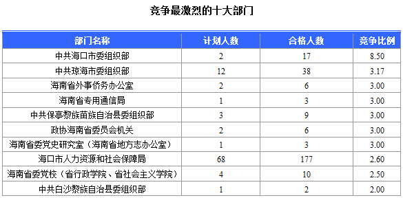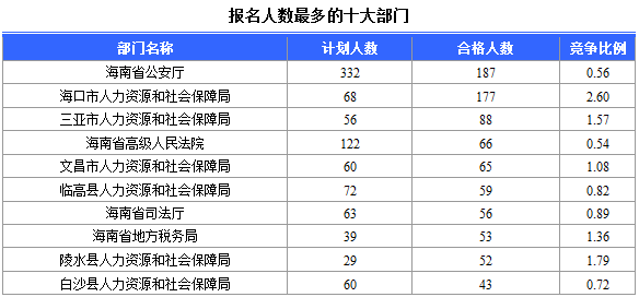 報(bào)名通過(guò)審核人數(shù)前十的職位主要集中在海南省高級(jí)人民法院、海口市人力資源和社會(huì)局、海南省林業(yè)廳,具體信息如下: