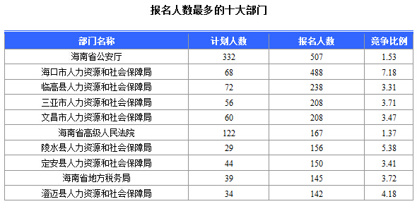 截至15日9時,報名人數前三位的部門依次是:海南省公安廳、海口市人力資源和社會局、臨高縣人力資源和社會局,三部門報名總人數達1233人,占報名總人數的27%。