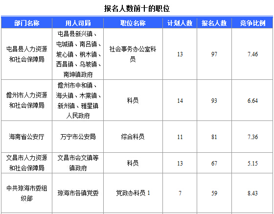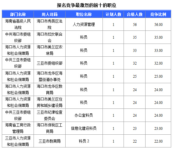 報名通過審核人數前十的職位主要集中在海南省高級人民法院、海口市人力資源和社會局、海南省林業廳,具體信息如下: