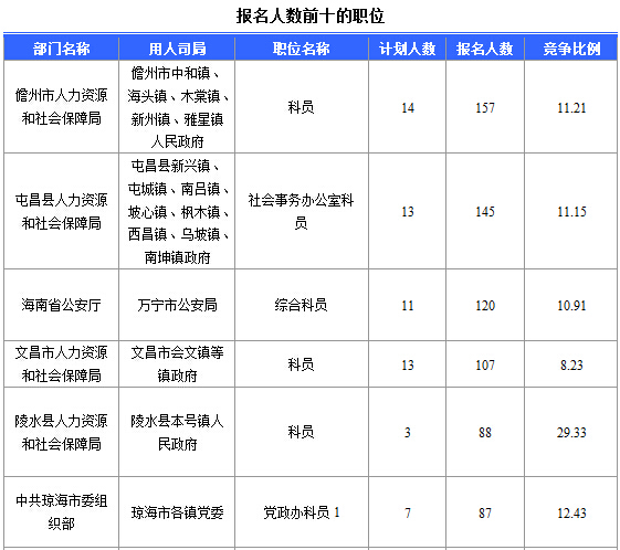 報名通過審核人數前十的職位主要集中在各大人力資源廳,具體信息如下: