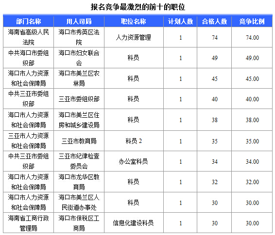 截止15日16時,招錄比例的職位為海南省高級人民法院海口市秀英區法院人力資源管理一職,招錄1人,截止15日16時通過人數為74人。