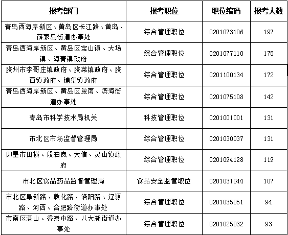 報名第一日青島市所屬的職位中,報名人數前三位的職位依次是:青島西海岸新區、黃島區長江路、黃島、薛家島街道辦事處(不限專業)、青島西海岸新區、黃島區寶山鎮、大場鎮、海青鎮政府(不限專業)、膠州市李哥莊鎮政府、膠萊鎮政府、膠西鎮政府、鋪集鎮政府(不限專業),報名人數分別為197、175、172,報錄比分別為:66:1;58:1;29:1