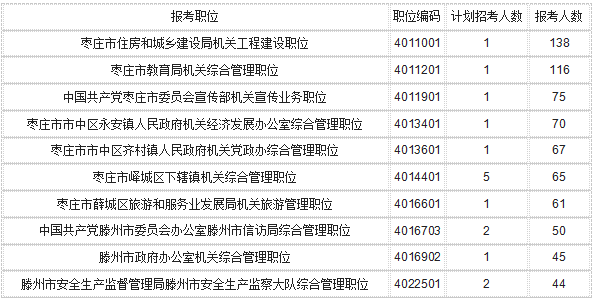 2016年省考報名棗莊地市所屬的職位中,報名人數前三位的職位依次是:滕州市安全生產監督管理局滕州市安全生產監察大隊綜合管理職位、滕州市政府辦公室機關綜合管理職位、中國共產黨滕州市委員會辦公室滕州市信訪局綜合管理職位,報考人數分別為138人、116人、75人。其中滕州市安全生產監督管理局滕州市安全生產監察大隊綜合管理職位競爭最為激烈,報名首日報考人數:招考人數的比例已達138:1.