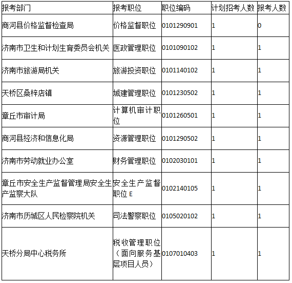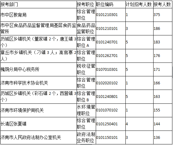 2016年濟南市所屬的職位中,報名人數前三位的職位依次是:市中區教育局綜合管理職位、市中區食品藥品監督管理局基層食藥監管所食品藥品監管職位、歷城區鄉鎮機關(董家鎮2個,唐王鎮3個)綜合管理職位A,競爭比例依次是:375:1、62:1、183:5。
