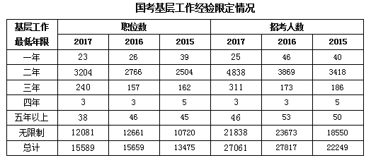 招考職位明確要求有基層工作經歷的,報考人員必須具備相應的基層工作經歷。基層工作經歷,是指具有在縣級及以下黨政機關、國有企事業單位、村(社區)組織及其他經濟組織、社會組織等工作的經歷。離校未就業高校畢業生到高校畢業生實習見習基地(該基地為基層單位)參加見習或者到企事業單位參與項目研究的經歷,可視為基層工作經歷。在軍隊團和相當于團以下單位工作的,可視為基層工作經歷。報考中央機關的人員,在地(市)直屬機關工作的經歷,也可視為基層工作經歷。