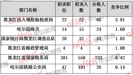 為幫助廣大考生更清晰的了解今日?qǐng)?bào)名情況,黑龍江中公網(wǎng)校整理了審核通過人數(shù)前六位的部門以及競(jìng)爭比例最激烈的六大部門,供廣大考生參考: