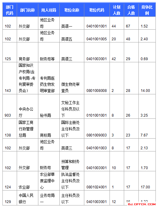 截止到15日16時,競爭比例的職位為農(nóng)業(yè)部農(nóng)業(yè)部草原監(jiān)理中心一職,招錄1人,截止到15日16時通過人數(shù)為17人,報名通過審核人數(shù)前十的職位主要集中在外交部、商務部、國家知識產(chǎn)權局(含專利局、專利復審委員會)等部門,具體信息如下: