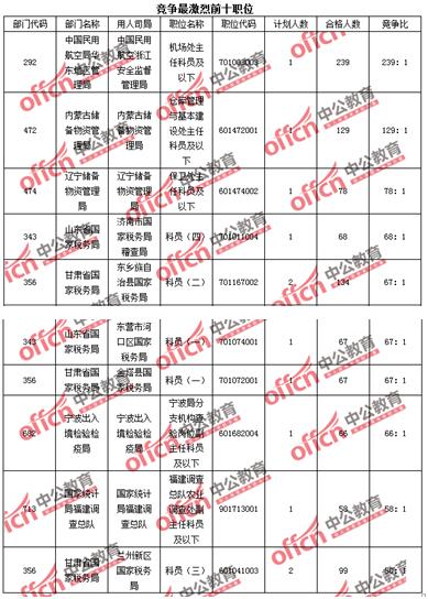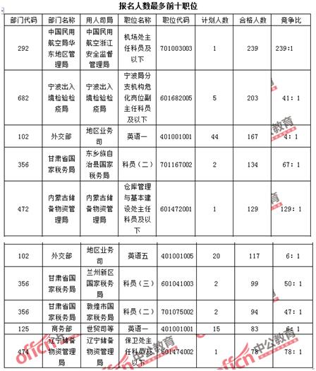 與昨天下午仍未有合格人數(shù)過百的職位相比,今日8時,已經(jīng)有6個職位合格人數(shù)過百,其中中國民用航空局華東地區(qū)管理局和寧波出入境檢驗檢疫局各有1個職位均200,與去年同期只有3個職位過百,且沒有過200的職位來看,今年報名初期勢頭很強勁。