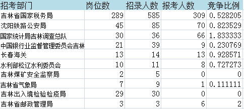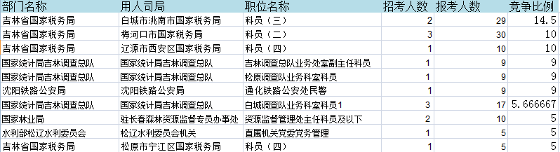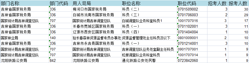 報(bào)名通過審核人數(shù)前十的職位主要集中在吉林省國(guó)稅局和國(guó)家統(tǒng)計(jì)局吉林調(diào)查總隊(duì),具體信息如下: