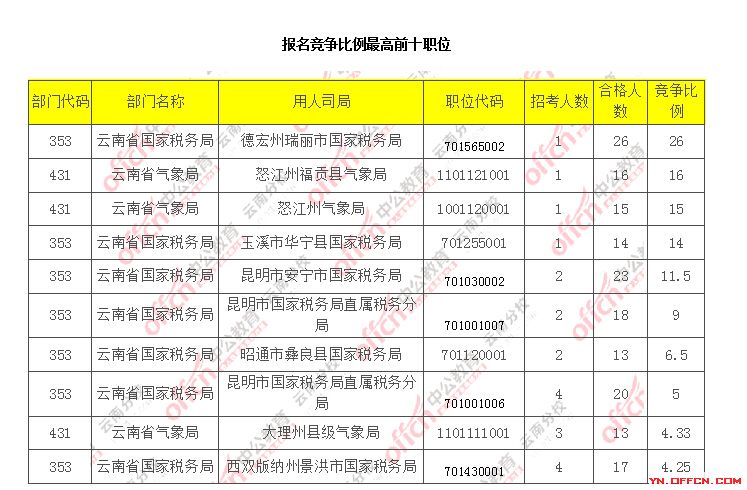 截止16日8時,招錄比例的職位為云南省國家稅務局,職位代碼是701565002,招錄1人,通過人數26人,競爭比26:1。