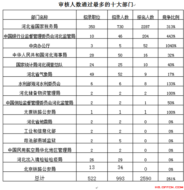 為幫助廣大考生更清晰的了解今日報名情況,河北中公網校整理了審核通過人數前十位的部門以及競爭比例最激烈的十大部門,供廣大考生參考: