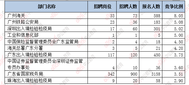 為幫助廣大考生更清晰的了解今日報名情況,廣東中公網校整理了審核通過人數前十位的部門以及競爭比例最激烈的十大部門,供廣大考生參考: