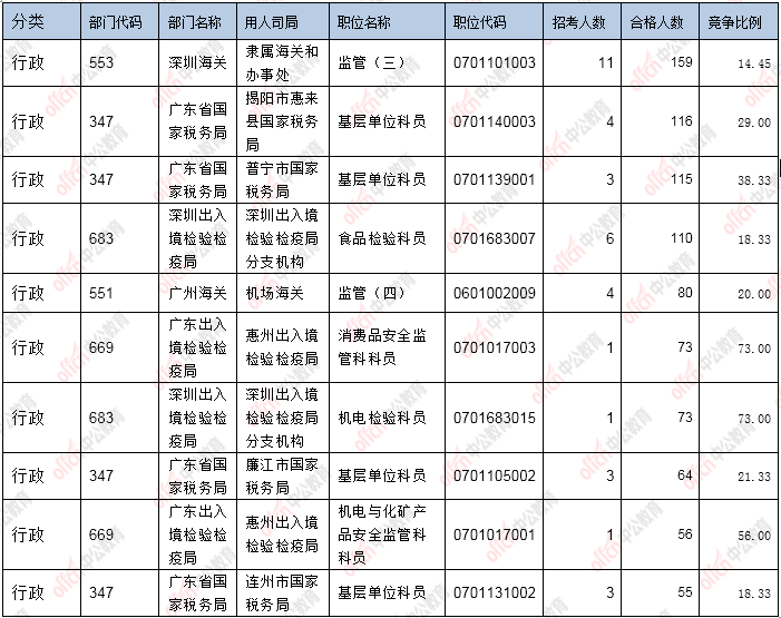 報名通過審核人數前十的職位主要集中在廣東國稅局、廣州海關、深圳海關等部門,具體信息如下: