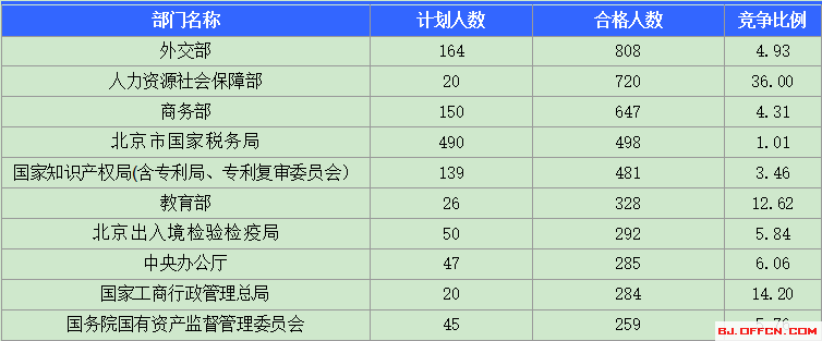 為幫助廣大考生更清晰的了解今日報名情況,北京中公網校整理了合格人數前十位的部門以及競爭比例最激烈的十大部門,供廣大考生參考: