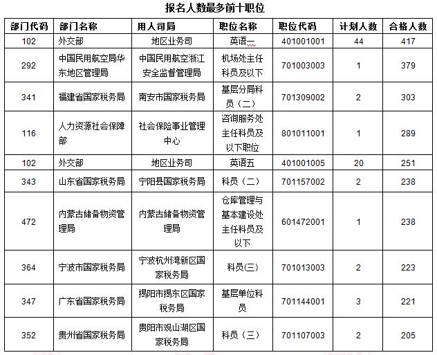 報名人數最多前十職位的合格人數均在200以上,外交部地區業務司英語一(職位代碼401001001)計劃招錄44人,目前已有417人報名,蟬聯報名人數最多前十職位榜單“寶座”,的原因除了外交部自身的魅力外,也與招錄基數較大有關。