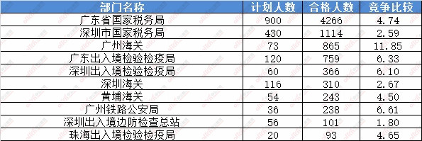 報名通過審核人數(shù)前十的職位主要集中在廣州海關(guān)、廣東出入境檢驗檢疫局、深圳出入境檢驗檢疫局等部門,具體信息如下: