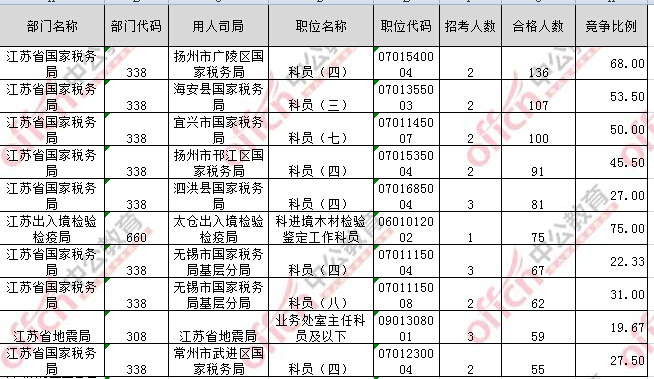 報名通過審核人數前十的職位主要集中在江蘇省國家稅務局、江蘇省地震局,具體信息如下: