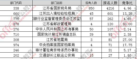 為幫助廣大考生更清晰的了解今日報名情況,江蘇中公教育整理了審核通過人數(shù)前十位的部門以及競爭比例最激烈的十大部門,供廣大考生參考: