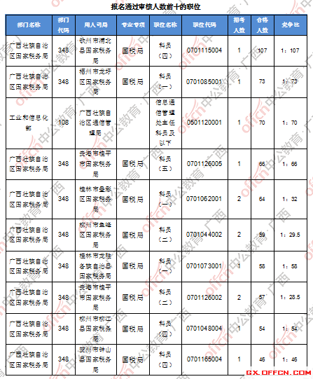 報名通過審核人數前十的職位主要集中在廣西壯族自治區國家稅務局、工業和信息化部等部門,具體信息如下: