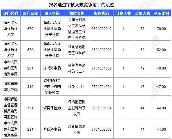 截止到17日16時,已有137個職位破0,且熱門職位人數競爭已經開始激烈,其中報名人數最多的職位為:海南出入境檢驗檢疫局,機電檢驗監管工作科員,共報名78人,競爭比例已高達78:1!