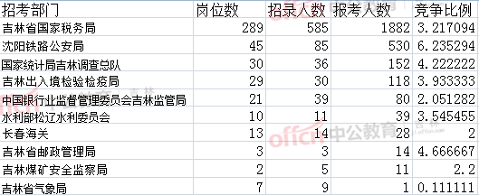 截止到17日16時,通過審核人數前三位的部門依次是:吉林省國家稅務局、沈陽鐵路公安局、國家統計局、吉林調查總隊,三部門通過審核總人數達2564人,占通過審核總人數的88.54%。 為幫助廣大考生更清晰的了解今日報名情況,吉林中公教育整理了審核通過人數最多的幾大部門以和競爭比例最激烈的幾大部門,供廣大考生參考: