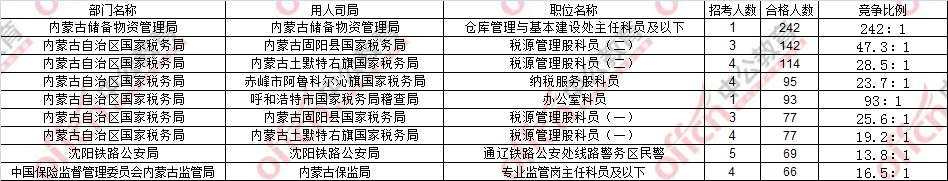 報名通過審核人數前十的職位主要集中在內蒙古儲備物資管理局、內蒙古固陽縣國家稅務局、內蒙古土默特右旗國家稅務局等部門,具體信息如下: