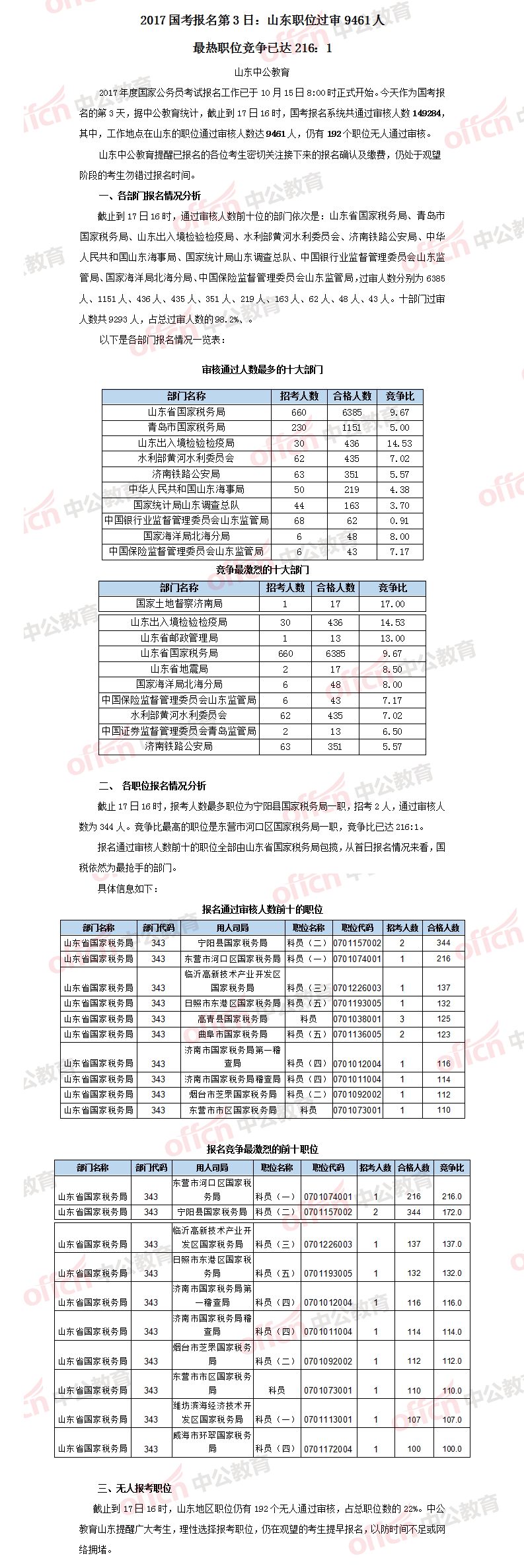【截至17日16時(shí)】2017國(guó)考報(bào)名山東職位過(guò)審9461人 最熱職位競(jìng)爭(zhēng)已達(dá)216:1