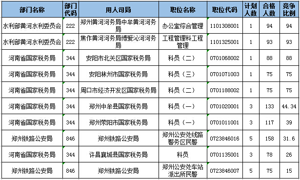 報名通過審核人數排名前列的職位主要集中在鄭州鐵路公安局、河南省國家稅務局,水利部黃河水利委員會,具體信息如下: