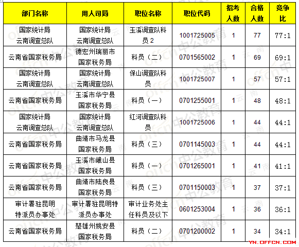 報名通過審核人數前十的職位主要集中在云南省氣象局、國家統計局云南調查總隊、云南省國家稅務局等部門,具體信息如下:
