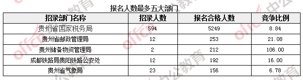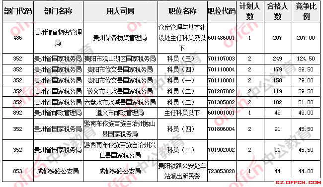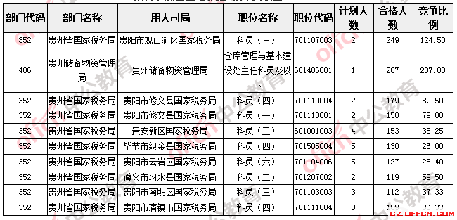 報名通過審核人數較多的職位主要集中在貴州省國家稅務局、貴州儲備物資管理局等部門,具體信息如下: