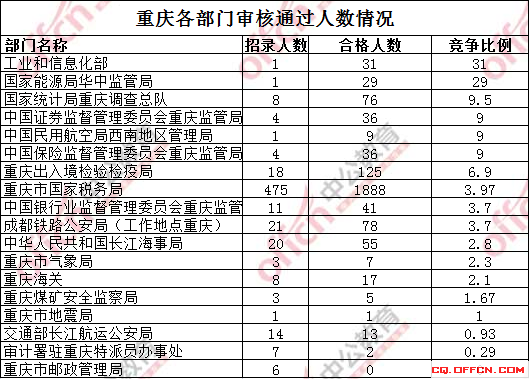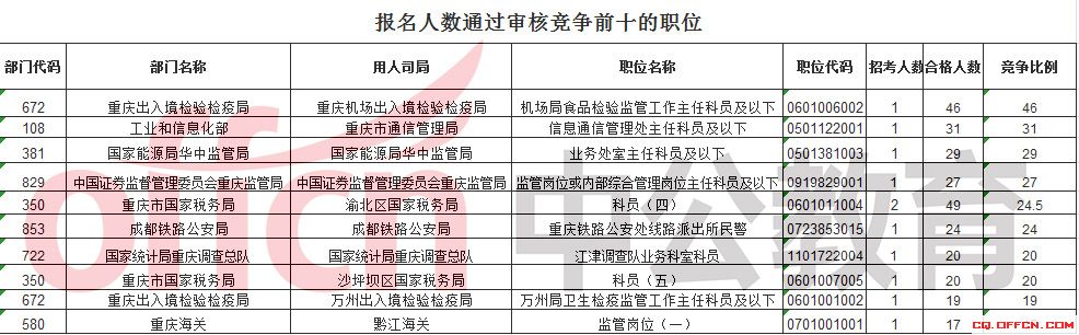 截止到15日16時,競爭比例的職位為‘重慶機場出入境檢驗檢疫局’一職,招錄1人,截止到17日16時通過人數為46人。但是還有很多崗位沒有人去報名。