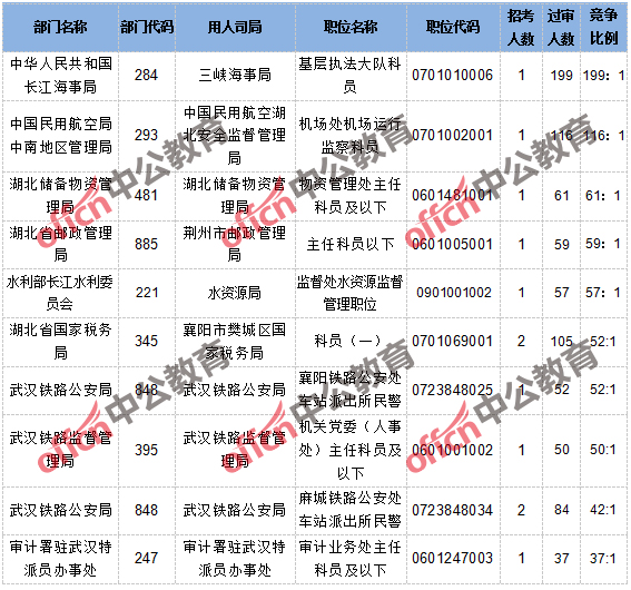 截止到10月17日16時,報名通過審核人數和競爭比例的職位為三峽海事局基層執法大隊科員一職,招錄1人,過審人數199人,競爭比例為199:1。具體信息如下: