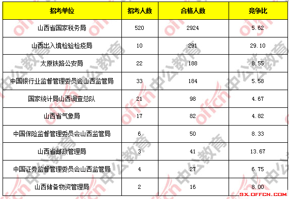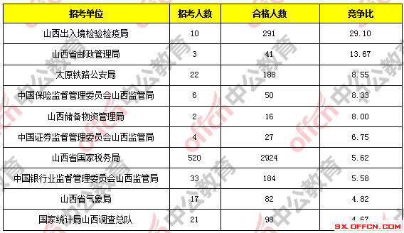 為幫助廣大考生更清晰的了解今日?qǐng)?bào)名情況,山西中公網(wǎng)校整理了合格人數(shù)前十位的部門以及競(jìng)爭(zhēng)比例最激烈的十大部門,供廣大考生參考: