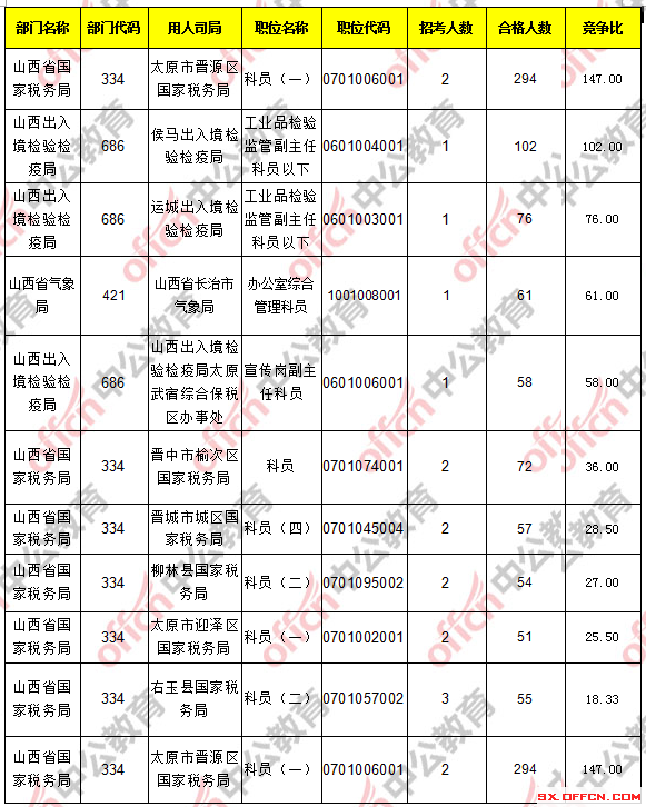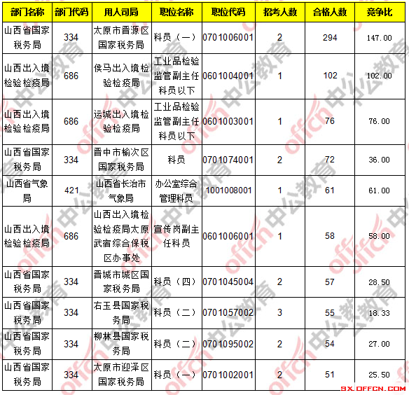 報(bào)考人數(shù)前十的職位主要集中在山西省國(guó)家稅務(wù)局、山西出入境檢驗(yàn)檢疫局這兩個(gè)部門,具體信息如下: