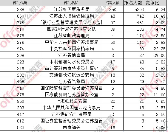 為幫助廣大考生更清晰的了解今日報名情況,江蘇中公網校整理了審核通過人數前十位的部門以及競爭比例最激烈的十大部門,供廣大考生參考: