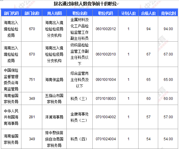 截止到18日8時,已有154個職位破0,且熱門職位人數競爭已經開始激烈,其中報名人數最多的職位為:海南出入境檢驗檢疫局,金屬材料及化工產品檢驗監管工作副主任科員,共報名94人,競爭比例已高達94:1!