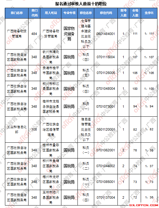 報名通過審核人數(shù)前十的職位主要集中在廣西儲備物資管理局、廣西壯族自治區(qū)國家稅務(wù)局、工業(yè)和信息化部等部門,具體信息如下:
