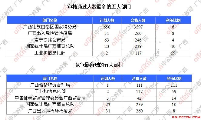 為幫助廣大考生更清晰的了解今日報名情況,廣西中公網(wǎng)校整理了審核通過人數(shù)前五位的部門以及競爭比例最激烈的五大部門,供廣大考生參考: