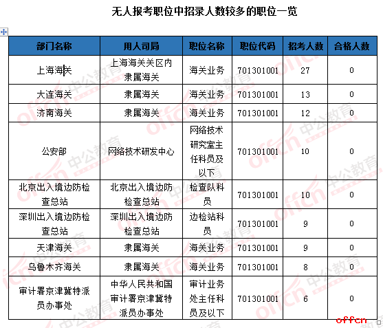 截止到18日8時,2016國考共有2805的崗位報考人數還未破零,占18%。中公網校分析,共有25個職位招錄人數在5人以上,主要分布在鐵路公安、國稅和海關系統。中公網校專家建議考生可以從這些職位中選取適合自己的。