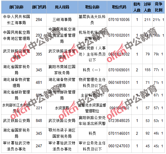 截止到10月18日8時,報名通過審核人數和競爭比例的職位為三峽海事局基層執法大隊科員一職,招錄1人,過審人數211人,競爭比例為211:1。具體信息如下: