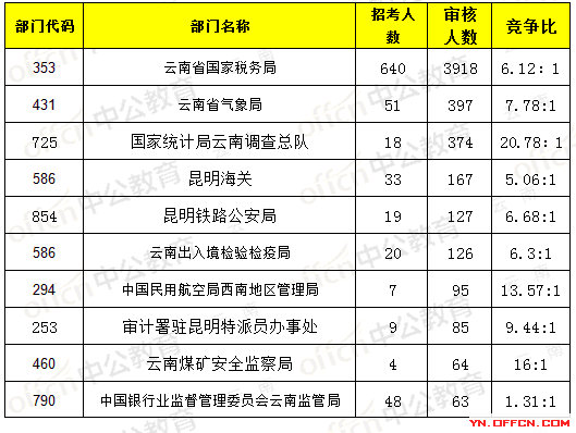 為幫助廣大考生更清晰地了解今日報名情況,云南中公網(wǎng)校整理了審核通過人數(shù)部門排名,供廣大考生參考: