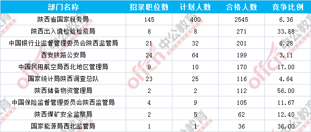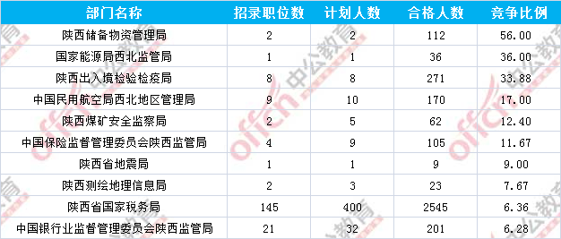 為幫助廣大考生更清晰的了解今日報名情況,陜西中公網校整理了審核通過人數前十位的部門以及競爭比例最激烈的十大部門,供廣大考生參考: