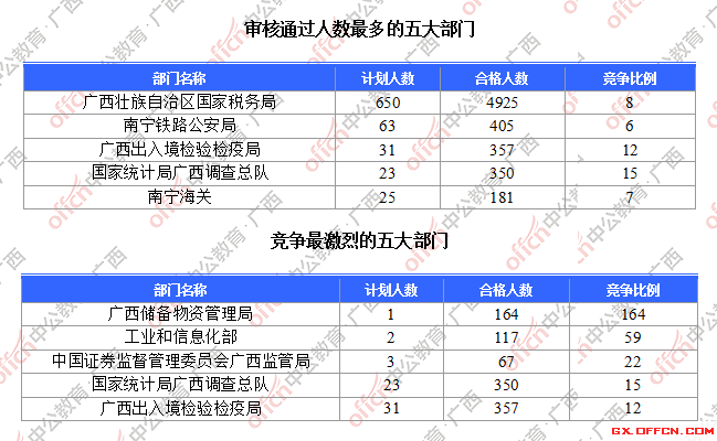 為幫助廣大考生更清晰的了解今日報名情況,廣西中公網校整理了審核通過人數前五位的部門以及競爭比例最激烈的五大部門,供廣大考生參考: