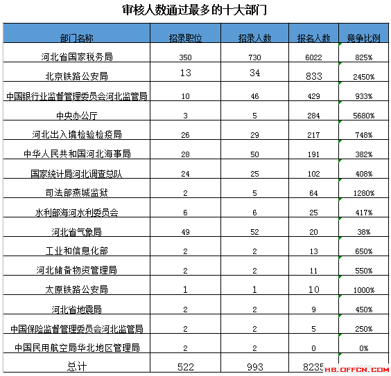 為幫助廣大考生更清晰的了解今日報名情況,河北中公網校整理了審核通過人數前十位的部門以及競爭比例最激烈的十大部門,供廣大考生參考: