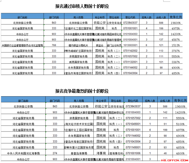 報名通過審核人數前十的職位主要集中在北京鐵路公安局、河北省國家稅務局、中國銀行業監督管理委員會河北監管局等部門,具體信息如下: