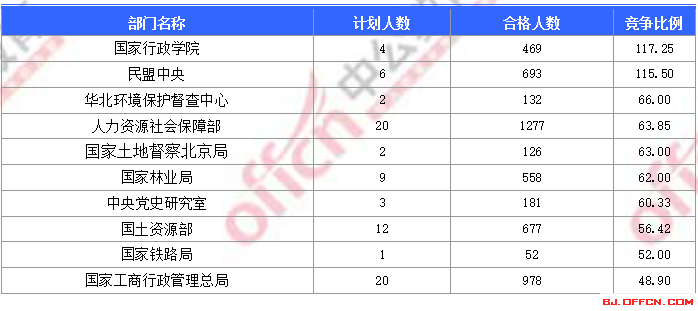 為幫助廣大考生更清晰的了解今日報名情況,北京中公網校整理了合格人數前十位的部門以及競爭比例最激烈的十大部門,供廣大考生參考: